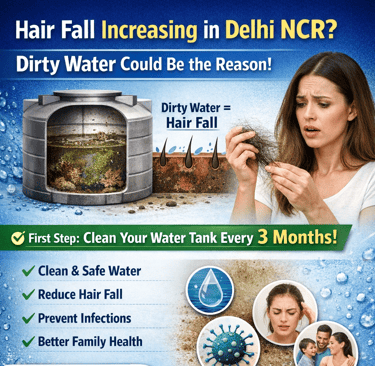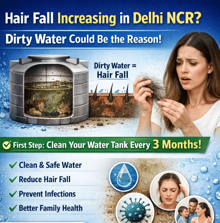 Many people in Delhi NCR are facing severe hair fall problems, and one major hidden cause is dirty and contaminated water. Unclean overhead or underground water tanks collect dust, algae, rust, and harmful bacteria over time. When this polluted water is used for bathing and washing hair, it directly affects your scalp health—leading to hair fall, dandruff, itching, and dryness.